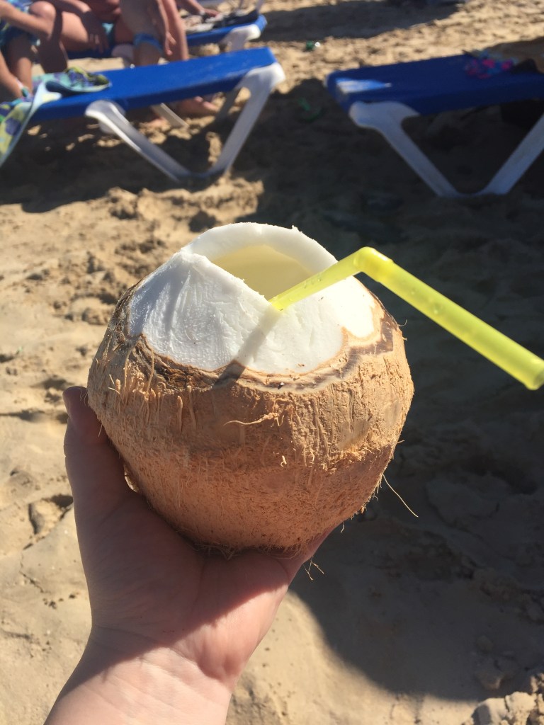 The bus stops at a couple of places along the way before reaching the beach area. It’s just lovely, no fuss, hot sand, great water, chairs and umbrellas you can rent for 2 CUC a piece and dudes walking up and down the beach with coconut drinks and souvenirs, but not like in Rio where you couldn’t get a moment’s rest before some guy would ask you to buy a bracelet or a dress or a pair of sunglasses. Just perfect!
